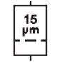 Filtr płynu o wielkości porów | Wskazuje infuzyjny lub transfuzyjny system wyrobu medycznego zawierający filtr o określonej nominalnej wielkości porów Liczbę 15 pokazano jako przykład i należy zastąpić ją odpowiednią wielkością porów | PN-EN ISO 15223-1:2022-01 Nr ref. symbolu 5.6.5. (ISO 7000-2727); MDR 2017/745 Załącznik I, pkt.23.2. (b) | Wyroby medyczne -- Symbole do stosowania wraz z informacjami dostarczanymi przez producenta -- Część 1: Wymagania ogólne Rozporządzenie PE i Rady (UE) 2017/745 z dnia 5 kwietnia 2017r. w sprawie wyrobów medycznych |